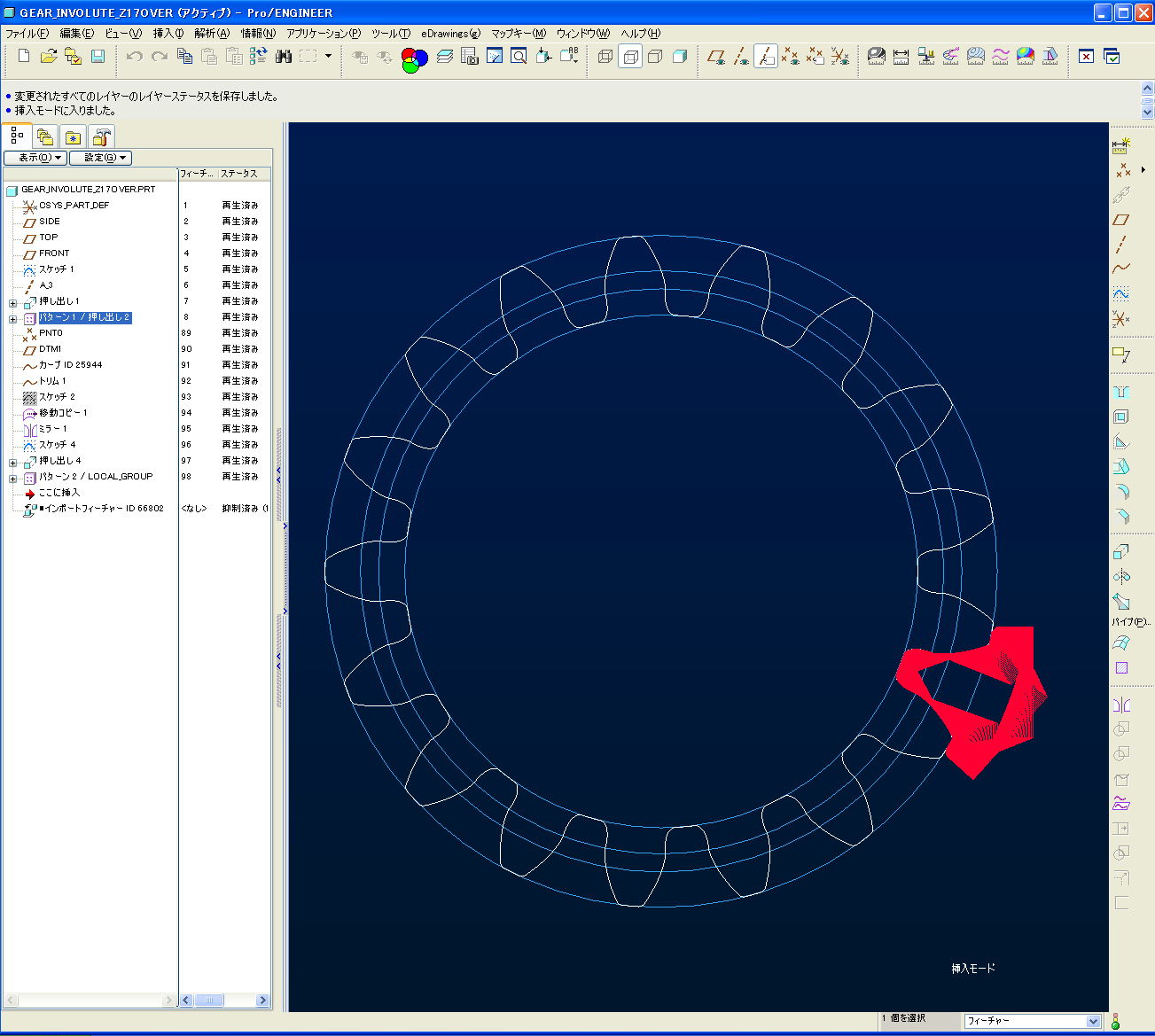 右の図は、モジュール1、歯数17のギアの歯形創成をモデリングした物です。1歯半分の創生歯形を作り、それを元にカッティング用スプライン曲線を作図し、基礎円より歯先側はインボリュート曲線を利用し、歯形をパターン化しています。創成ラックの歯先Rはゼロでモデリングしています。やはり簡易的なモデリングとは形状に違いが出てきます。ここで注目したいのが、基礎円より歯先側でも、切込みが発生している事です。1歯の創成の様子を80分割のパターンで再現しましたので、それなりの精度だと思います。